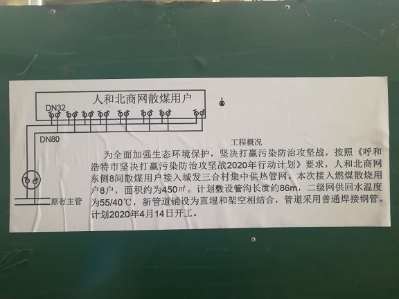 按照《呼和浩特市堅(jiān)決打贏污染防治攻堅(jiān)戰(zhàn)2020年行動計(jì)劃》總體要求,該項(xiàng)目接入燃煤散燒用戶42戶,面積約2450平方米,其中一家村豐州路西34戶,2000平方米;人和北商網(wǎng)8戶,450平方米。該項(xiàng)目計(jì)劃敷設(shè)管線溝槽長度約174米,其中一家村豐州路西為88米,人和北商網(wǎng)為86米。新管道鋪設(shè)以直埋和架空相結(jié)合的方式,全部采用普通焊接鋼管,開工時(shí)間為2020年4月14日。