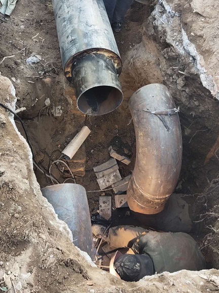 9月27日,展東路與海拉爾大街十字路口的一次網(wǎng)跑水,開挖后發(fā)現(xiàn)相鄰的排污管道有破損,供熱管道浸泡在污水中,腐蝕嚴(yán)重,需要先處理好污水管道才能搶修熱力管道,增大了施工難度。經(jīng)過幾次嘗試,最終決定對漏點(diǎn)處進(jìn)行線位改遷,重新鋪設(shè)管道。經(jīng)過10天持續(xù)不斷、緊張輪流作業(yè),于10月6日中午,終于修復(fù)管網(wǎng)漏點(diǎn),保證了管網(wǎng)注水試壓。