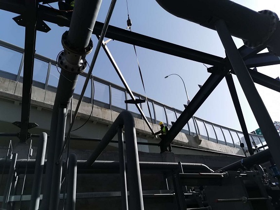 在檢查內(nèi)蒙古高路公司新建熱力站安裝屋頂鋼結(jié)構(gòu)及屋面彩鋼板項目時發(fā)現(xiàn)施工人員在高空作業(yè)雖然佩戴了安全帶、安全帽,但未按要求懸掛安全表示;檢查人員要求施工負責人立即按照安全帶使用規(guī)范進行整改,并責令安全質(zhì)檢處跟進整改的情況。