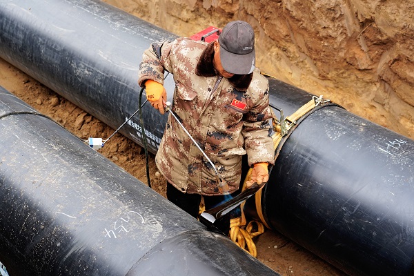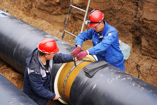 在施工現(xiàn)場,筆者看到,5米深的管溝內(nèi),一段一段已焊接好的DN700管線向遠方延伸著。在管溝內(nèi),工人們穿著厚厚的棉服,有的在為管道探傷、有的在為管道焊接口做保溫。