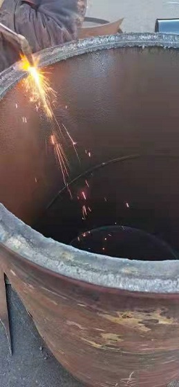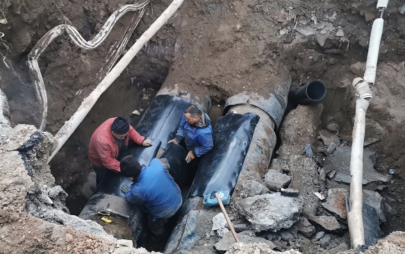 在場人員研究制定了搶修方案,決定不更換管道,而采用"包裹式"的方式進(jìn)行修復(fù)--在原DN700的老舊管道上包裹DN800的管套封堵漏點,將DN800的管道切割成兩部分,分別安裝,與水泥管道接近的部分打磨成壁度在4公分以內(nèi)的管壁,焊接后進(jìn)行管道碰口。當(dāng)時,室外溫度已降至-15℃,地溝內(nèi)溫度高,地面溫度低,施工難度大。為保證快速、高效、安全完成新管套接,搶修人員只能手提工具沿著管道貓著腰爬到連接處,窩在管道下方,在管套與管網(wǎng)連接處焊接。