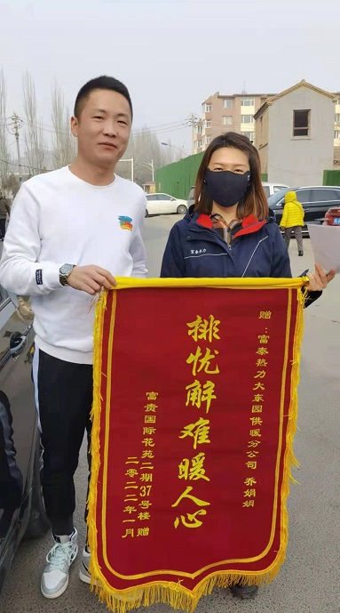 玉泉分公司員工喬娟娟在富貴國際花園走訪時得知小區(qū)二期37號樓進入11月份后整棟樓就出現(xiàn)溫度偏低現(xiàn)象,她和同事們迅速開始排查原因。該棟樓共有5層10戶熱用戶,他們用了一天時間逐層逐戶對熱用戶家中的濾網(wǎng)進行了清洗,但是效果不是很理想。于是他們又對負一層主管網(wǎng)的除污器進行了清洗,一系列的操作完成后又是整整一天,第二天回訪熱用戶時得知溫度只提升了2度,為了讓熱用戶溫暖過冬,喬娟娟又和同事們對該棟樓主管道的所有支管進行了沖洗,再次回訪熱用戶時發(fā)現(xiàn),該棟樓其他熱用戶家中溫度都很好,只有301熱用戶家中的溫度還是偏低,為了找到原因,喬娟娟和同事們對用戶家中的暖氣管道敷設情況進行了測量,再次沖洗了管道,同時積極聯(lián)系到已經(jīng)辦理停供的401熱用戶進行了復供,該熱用戶家中溫度偏低問題得到解決。"排憂解難暖人心"為了表達感謝之情,1月9日,301熱用戶聯(lián)系到了正在小區(qū)走訪的喬娟娟,親手遞給她一面錦旗。