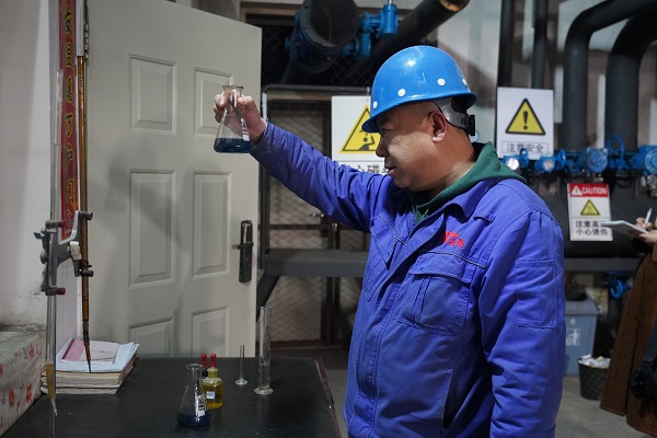 在水化A車間,劉丁一穿上工作服,戴上防護用具,立刻進入工作狀態(tài)?;灩ぷ骺菰锓ξ?,但對質(zhì)量的要求卻精益求精,從接樣到測量再到數(shù)據(jù)分析,他嫻熟地倒著試劑、觀察著試劑瓶,一支燒瓶、一些水、幾滴試劑,隨著劉丁一搖晃的燒瓶,漸漸的,瓶子中的水從紫紅色,變成了淺藍色。為了檢驗軟化水的質(zhì)量是否達標,確保鍋爐一次網(wǎng)用水安全,這一天他要對水質(zhì)至少進行8次檢驗。