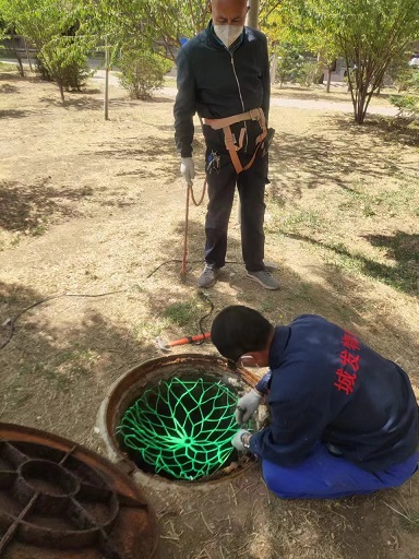 安裝現(xiàn)場(chǎng),工作人員打開(kāi)井蓋通風(fēng),在用氣體檢測(cè)儀檢測(cè)井內(nèi)的氣體符合作業(yè)條件后,工作人員綁好安全帶用電鉆在井壁上鉆孔,釘入尾端帶鉤的膨脹螺栓,擰緊固定后將防墜網(wǎng)掛到掛鉤上,一張防墜網(wǎng)就安裝完成。現(xiàn)場(chǎng)工程師傅每完成一個(gè)防墜網(wǎng)的安裝,在確保安全的情況下,都會(huì)親身踩試檢驗(yàn),確保安裝牢固。