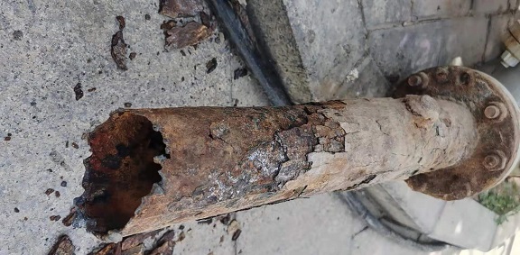 筆者用腳稍微用力踩了一下從地溝拆除出的腐蝕嚴重管道,一片片鐵銹渣渣就掉了下來。