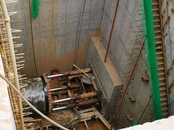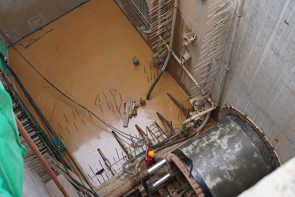 施工現(xiàn)場機器轟鳴,說話需要提高分貝。一進入施工現(xiàn)場,就看到前方有一個沉井,沉井20米深、13.4*7.3米間方,這個沉井是挖掘井,在河的對岸還有一個深15.5米的接收井。從沉井圍欄邊看井底,下邊的工作人員都顯得特別的渺小,20米深的井相當于6層樓高,恐高的人都不敢往下看。