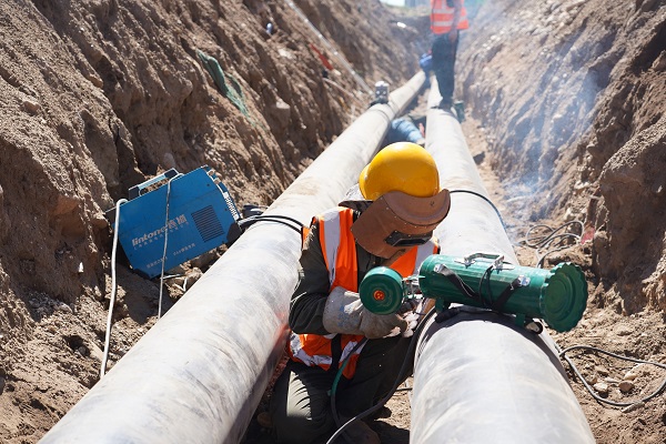 一個工人師傅,側身躺在兩個管道中間的狹小夾縫中,對管道進行焊接。施工單位天津管道公司的段步雨向筆者介紹,"現在這個師傅做的是第二道工序,叫電焊造面。你看到這么長的管子,都是一截一截焊接起來的,焊接要兩道工序,第一道是氬弧焊打底,就是在電弧焊的周圍通上保護氣體----氬氣,使焊材不能和空氣中的氧氣接觸,從而防止了焊材的氧化,所以第一遍要用氬弧焊,就是為了焊口不生銹,確保它的使用年限。氬弧焊完成后,為了管道外壁齊平,焊口更牢靠,再進行第二遍電焊造面。"